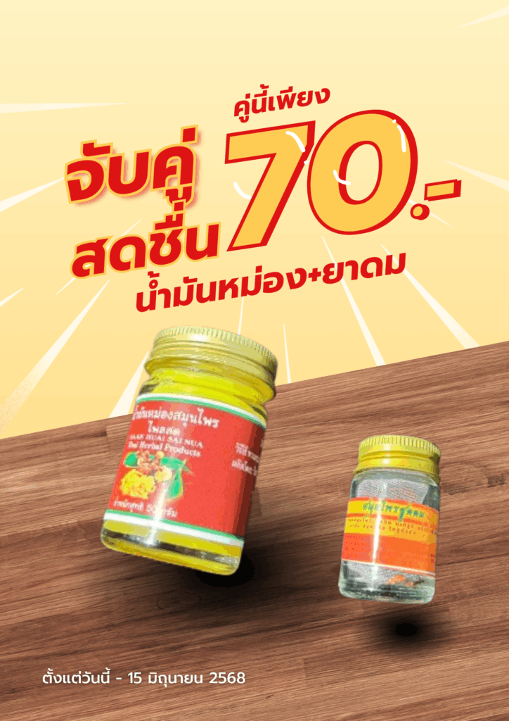 Posted on 27/05/202527/05/2025 by admin — Leave a commentจับคู่สมุนไพรเพื่อความสดชื่นและบรรเทาอาการ 🛡️ น้ำมันหม่องสมุนไพรไพลสดช่วยบรรเทาเมื่อยล้า ปวดกล้ามเนื้อ เคล็ดขัดยอกกลิ่นหอมผ่อนคลาย ใช้ทาได้ทั้งตัว 💨 ยาดมสมุนไพรช่วยให้หายใจโล่ง สดชื่นทันที เมื่อล้า เหนื่อย คัดจมูก 💥 ซื้อคู่สุดคุ้ม!น้ำมันหม่อง 60 บาท + ยาดม 25 บาทซื้อคู่ลดพิเศษเหลือเพียง 70 บาทเท่านั้น!